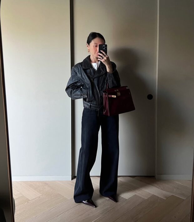 Usar a jaqueta totalmente fechada, como se fosse uma blusa, cria uma silhueta mais clean, minimalista e superatual. A combinação funciona bem com saia midi, jeans reto ou calça de alfaiataria.