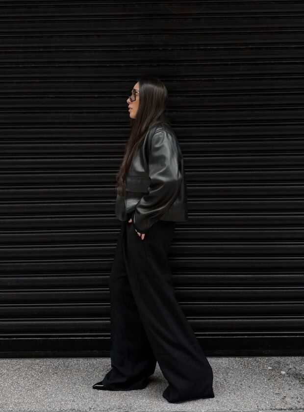 O look com calça e camiseta branca deixou de ser básico quando adicionou a jaqueta de couro e a mule preta de brilhos à equação. Os detalhes fazem, sim, a diferença!