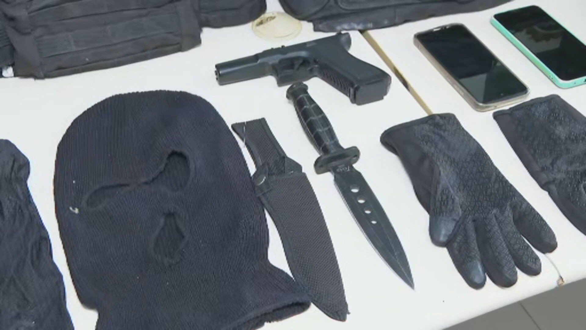 Toucas e armas apreendidas pela polícia em operação contra a milícia em Belford Roxo